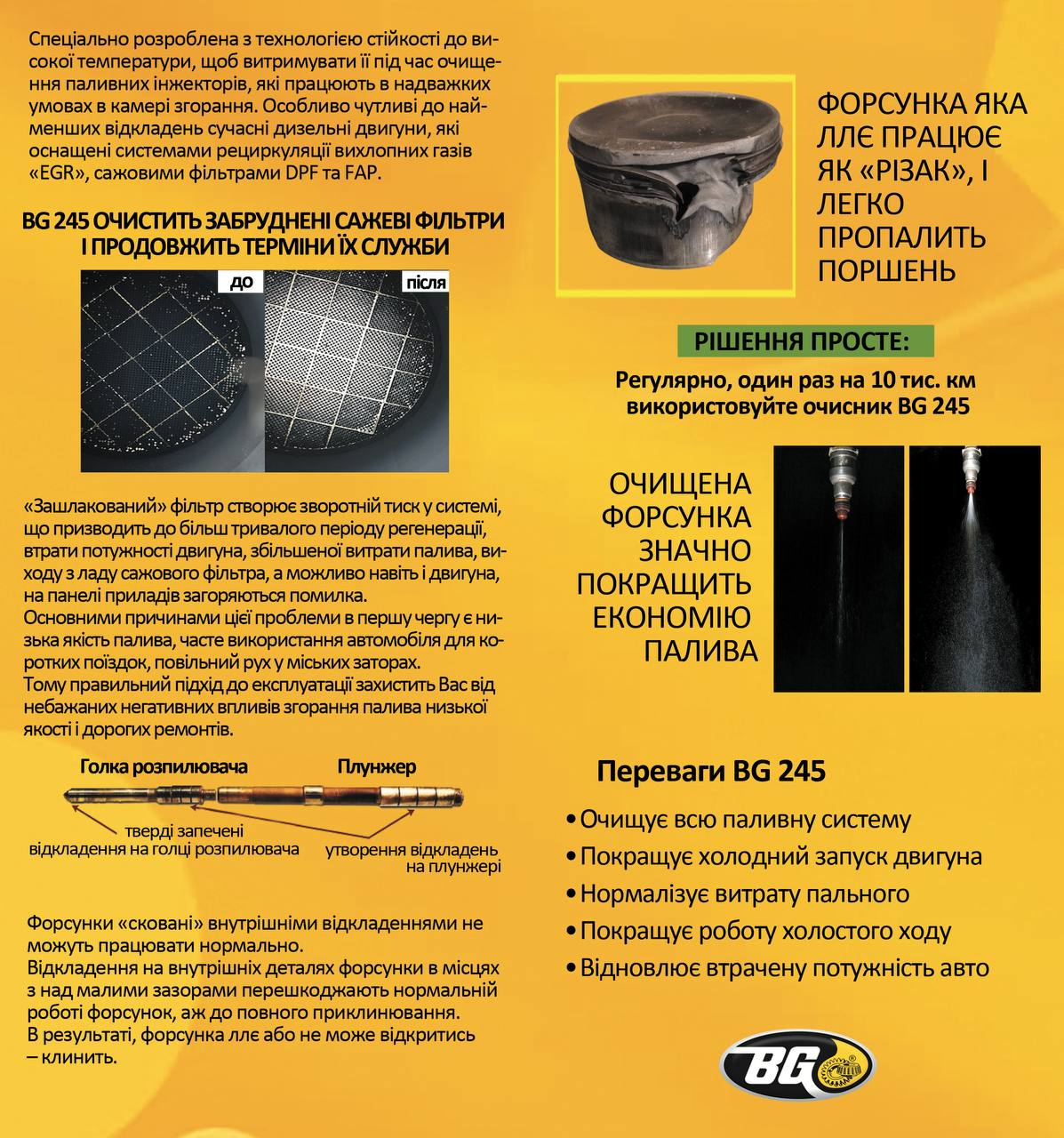 BG 245® Преміальний очищувач дизельної паливної системи Видаляє відкладення з усієї системи упорскування дизельного палива, включаючи сильні відкладення в камерах згоряння та всередині форсунок систем HPCR.