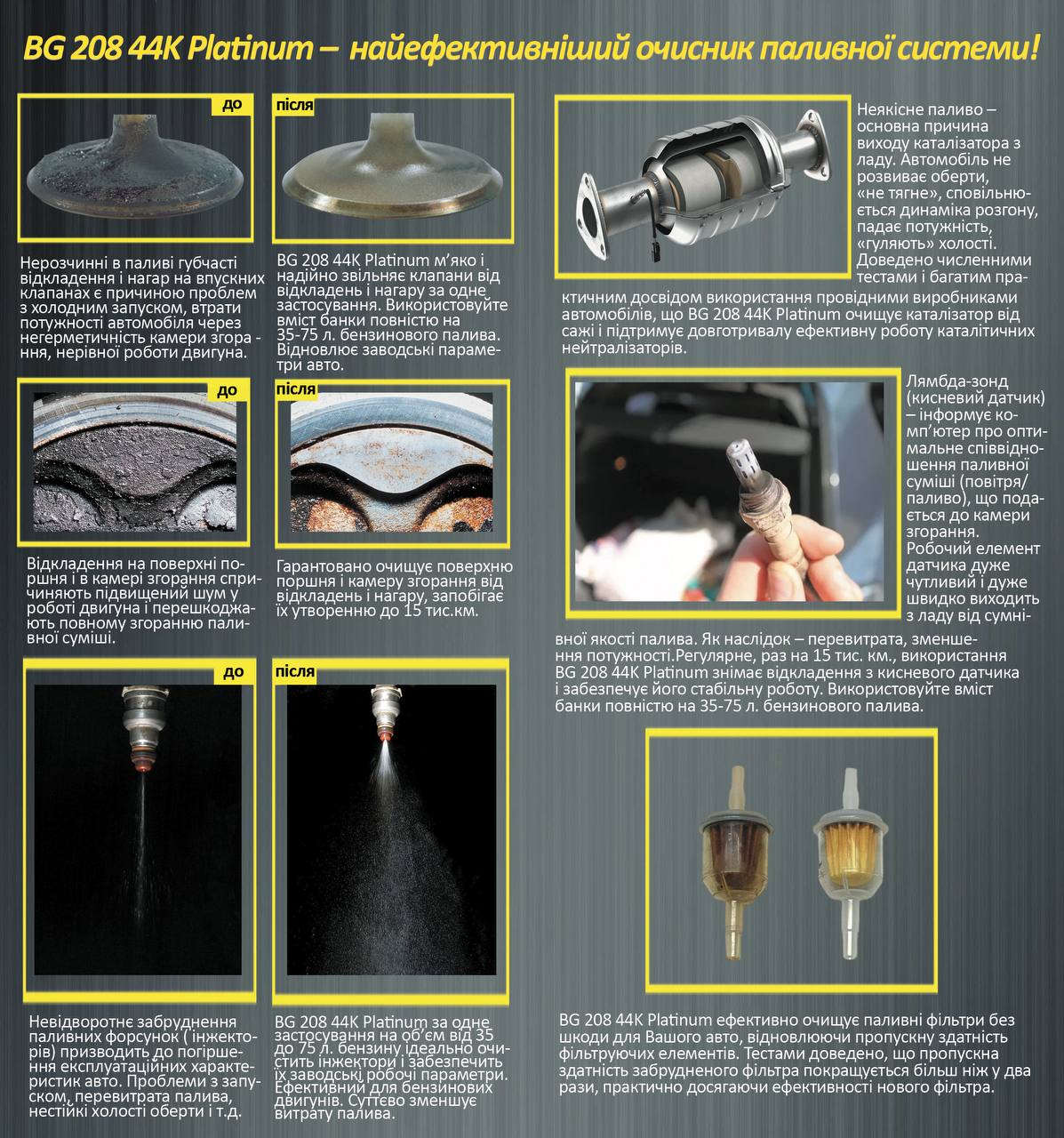 BG Platinum® 44K® очищає всю паливну систему, включаючи форсунки, паливні фільтри та камери згоряння. Ефективно видаляючи відкладення у верхній частині двигуна, BG Platinum® 44K® знижує проблеми, спричинені накопиченням відкладень, такі як пульсації двигуна, пропуски запалювання, нестійка робота двигуна, перебої в роботі та втрата потужності. BG Platinum® 44K® забезпечує швидке очищення закоксованих форсунок та корозійних відкладень на паливному насосі.